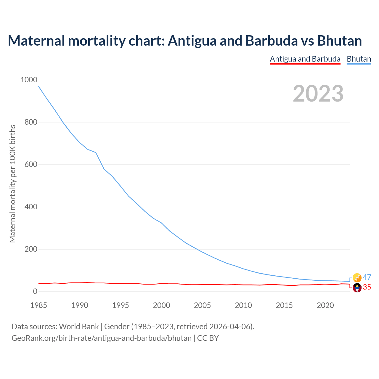 The maternal mortality rate, which is the probability of dying during childbirth or within 42 days of pregnancy termination, is 35 deaths per 100,000 live births in Antigua and Barbuda, compared to 47 deaths in Bhutan.