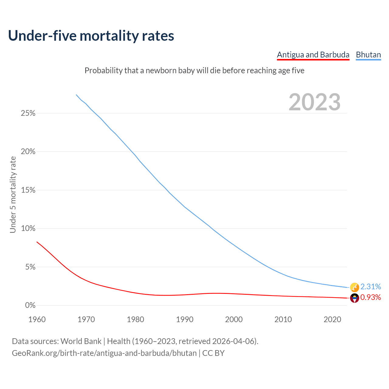 The chance that a newborn baby will die before reaching age five is 0.93% in Antigua and Barbuda and 2.31% in Bhutan. Above is a chart with historical data on under-five mortality rates.