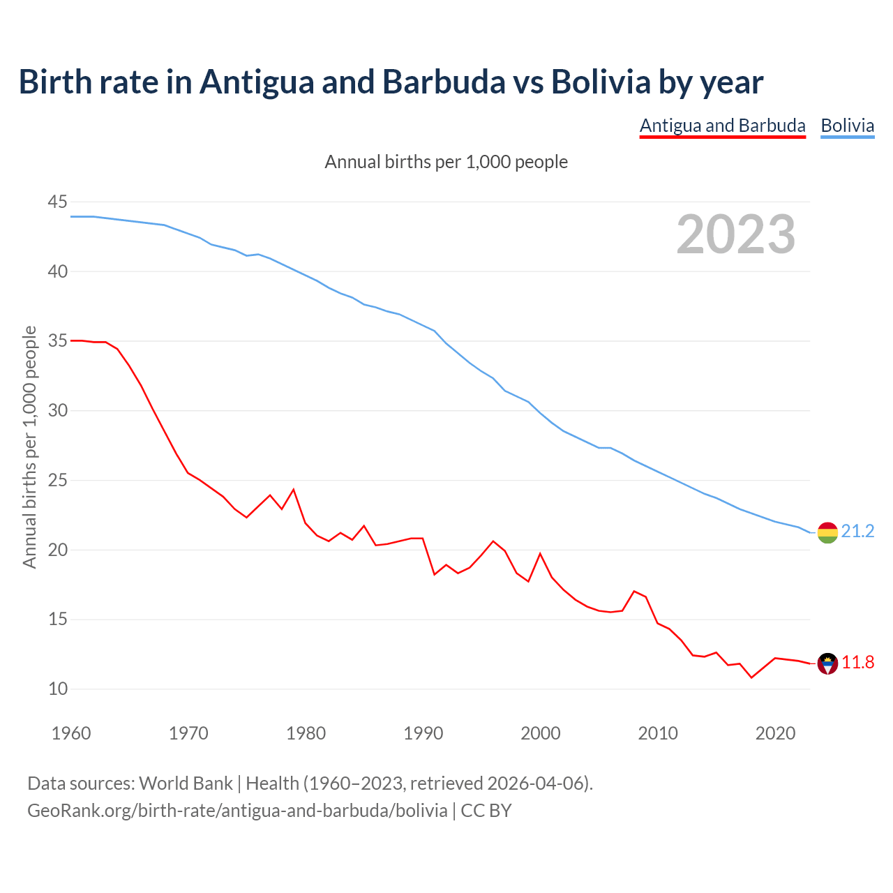 Antigua and Barbuda has an annual birth rate of 11.8 births per 1,000 people, compared to 21.2 for Bolivia. The average number of children a woman is expected to have during her lifetime — the fertility rate, is 1.58 in Antigua and Barbuda and 2.55 in Bolivia — 61.4% difference.