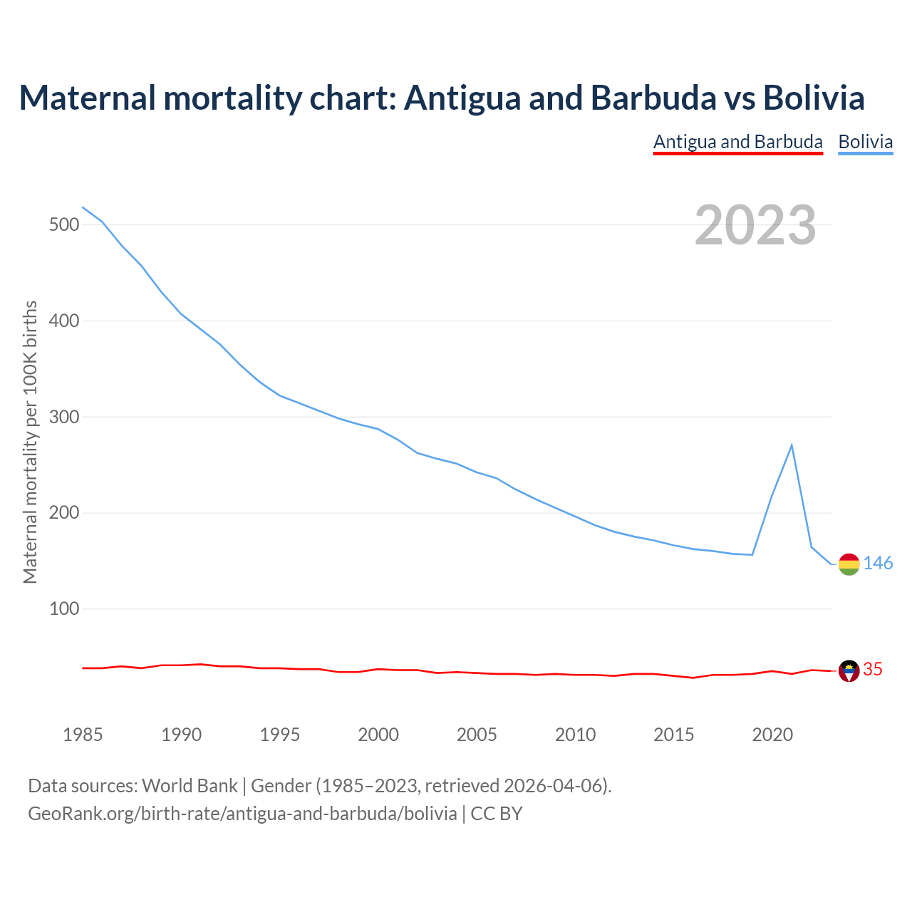 The maternal mortality rate, which is the probability of dying during childbirth or within 42 days of pregnancy termination, is 35 deaths per 100,000 live births in Antigua and Barbuda, compared to 146 deaths in Bolivia.