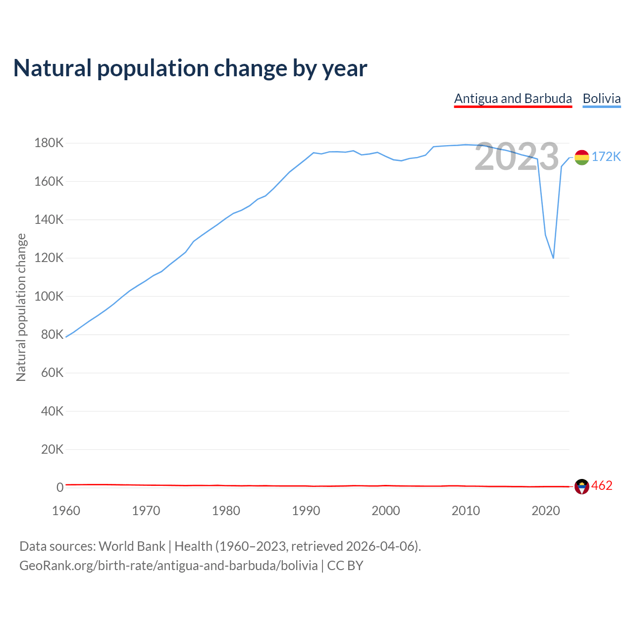 According to the latest available data on birth rates, the fertility rate in Antigua and Barbuda was 1.58 children per woman in 2023, compared to 2.55 in Bolivia in 2023. The replacement level is considered to be 2.1 children per woman.