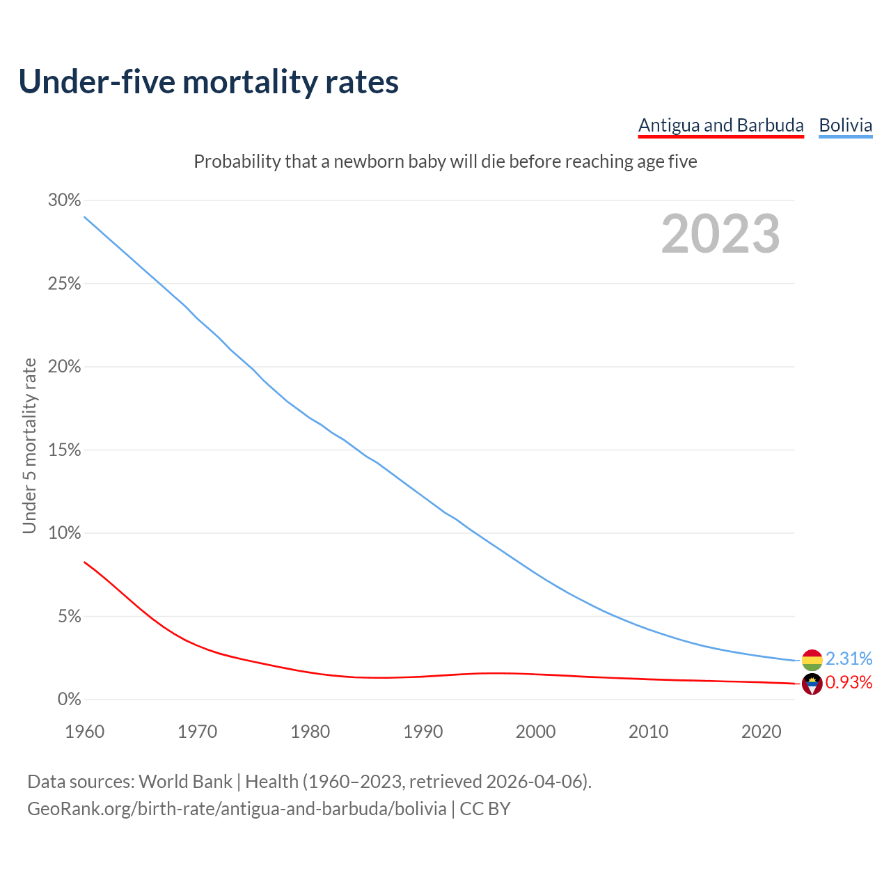The chance that a newborn baby will die before reaching age five is 0.93% in Antigua and Barbuda and 2.31% in Bolivia. Above is a chart with historical data on under-five mortality rates.