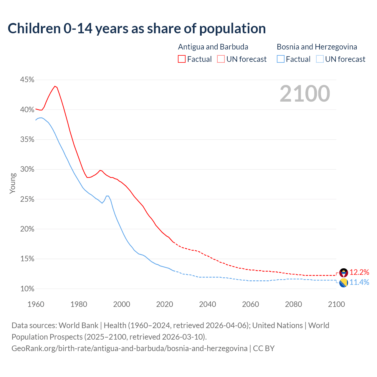 According to the latest available data on birth rates, the fertility rate in Antigua and Barbuda was 1.58 children per woman in 2023, compared to 1.49 in Bosnia and Herzegovina in 2023. The replacement level is considered to be 2.1 children per woman.