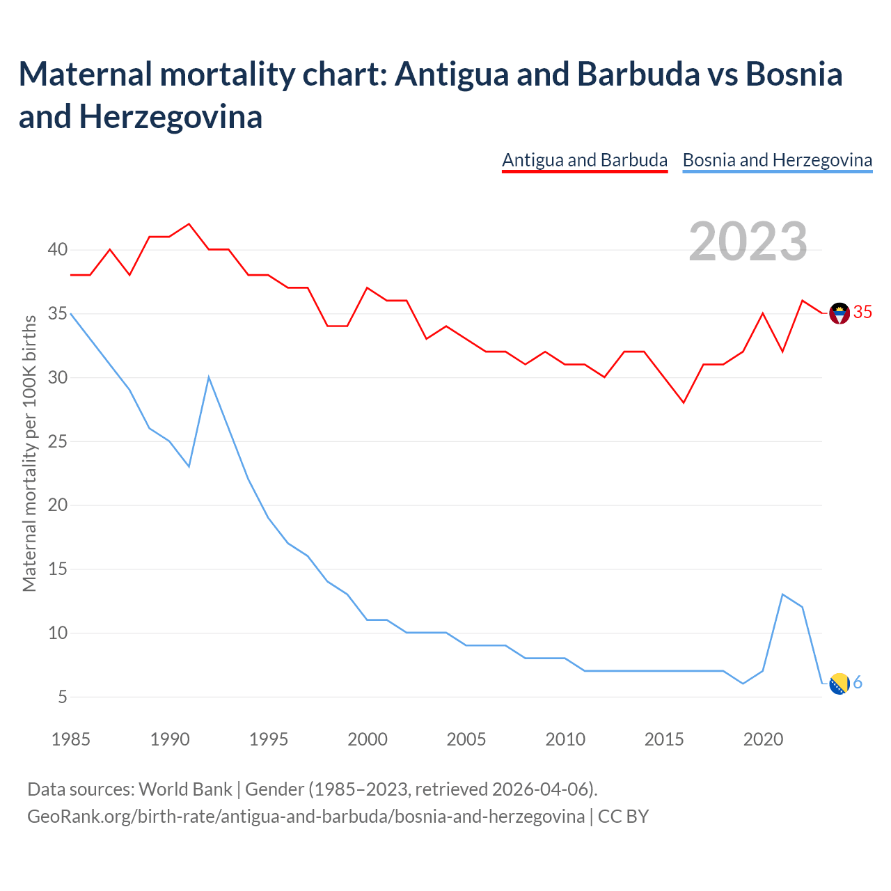 The maternal mortality rate, which is the probability of dying during childbirth or within 42 days of pregnancy termination, is 35 deaths per 100,000 live births in Antigua and Barbuda, compared to 6 deaths in Bosnia and Herzegovina.