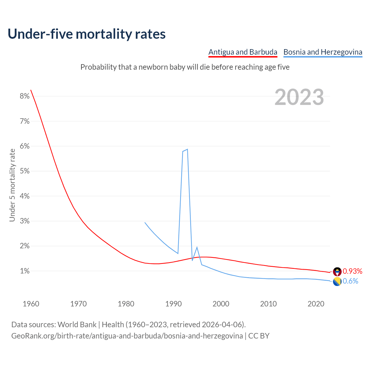 The chance that a newborn baby will die before reaching age five is 0.93% in Antigua and Barbuda and 0.6% in Bosnia and Herzegovina. Above is a chart with historical data on under-five mortality rates.