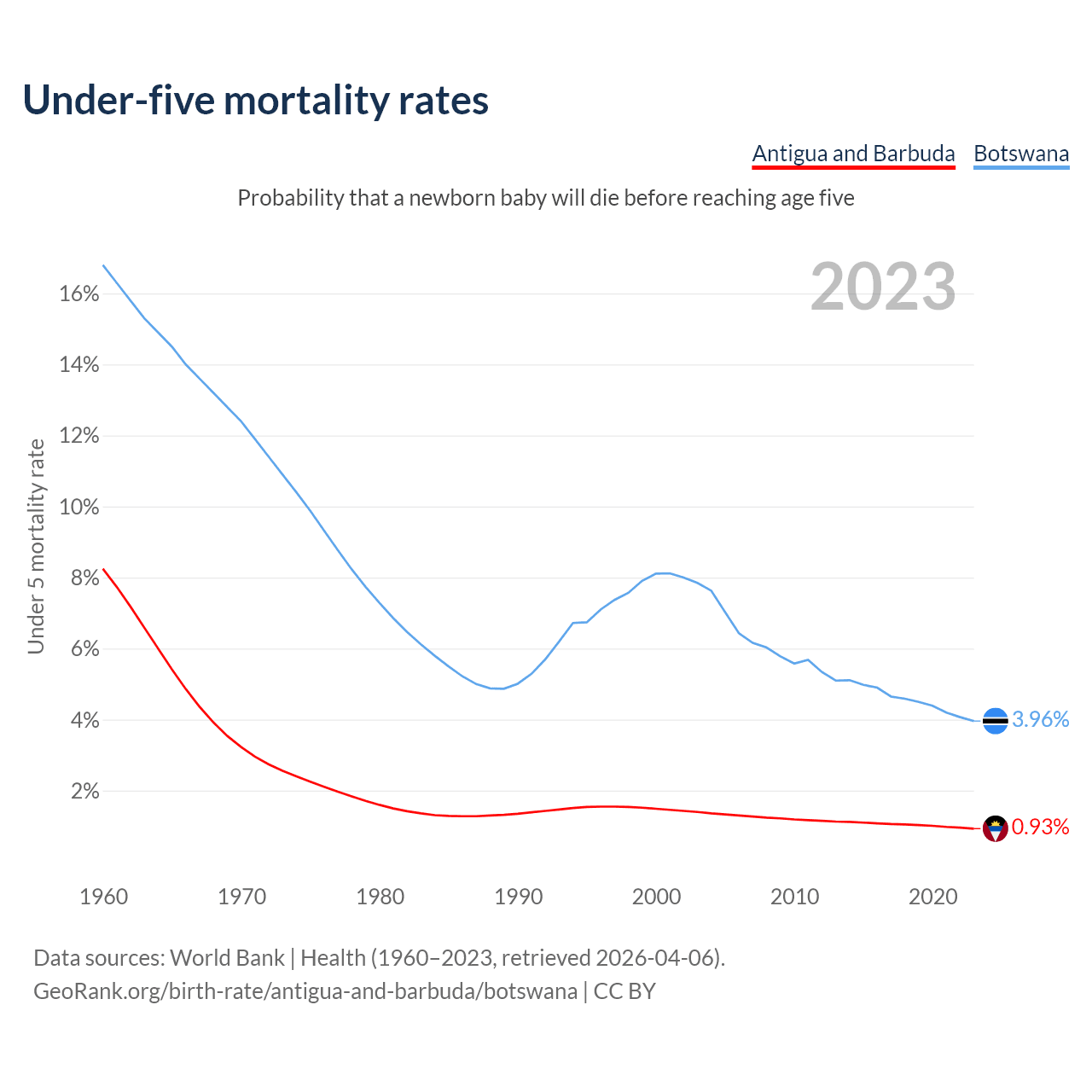 The chance that a newborn baby will die before reaching age five is 0.93% in Antigua and Barbuda and 3.96% in Botswana. Above is a chart with historical data on under-five mortality rates.