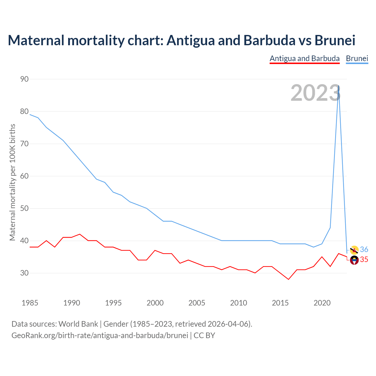 The maternal mortality rate, which is the probability of dying during childbirth or within 42 days of pregnancy termination, is 35 deaths per 100,000 live births in Antigua and Barbuda, compared to 36 deaths in Brunei.