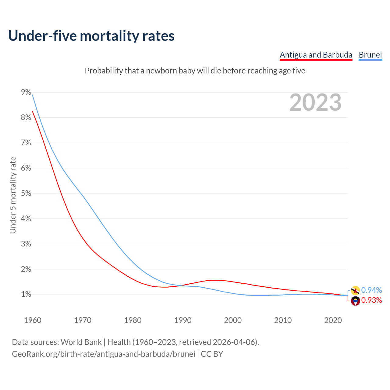 The chance that a newborn baby will die before reaching age five is 0.93% in Antigua and Barbuda and 0.94% in Brunei. Above is a chart with historical data on under-five mortality rates.
