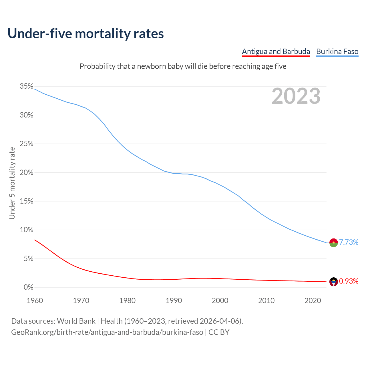 The chance that a newborn baby will die before reaching age five is 0.93% in Antigua and Barbuda and 7.73% in Burkina Faso. Above is a chart with historical data on under-five mortality rates.