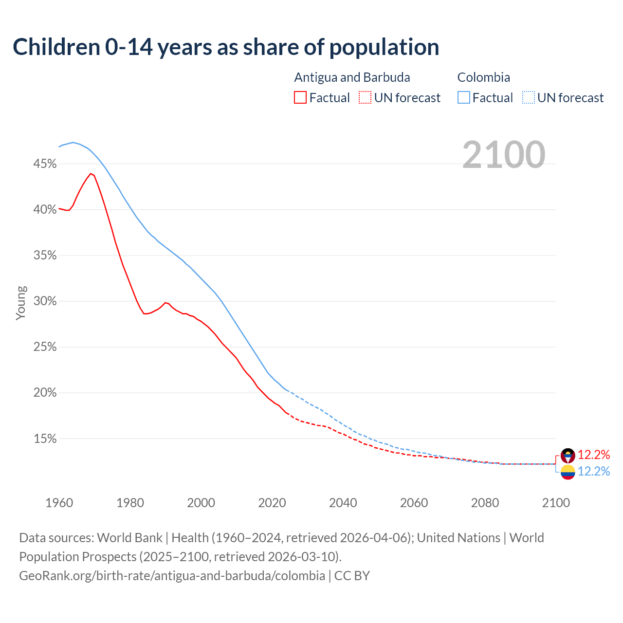 According to the latest available data on birth rates, the fertility rate in Antigua and Barbuda was 1.58 children per woman in 2023, compared to 1.65 in Colombia in 2023. The replacement level is considered to be 2.1 children per woman.