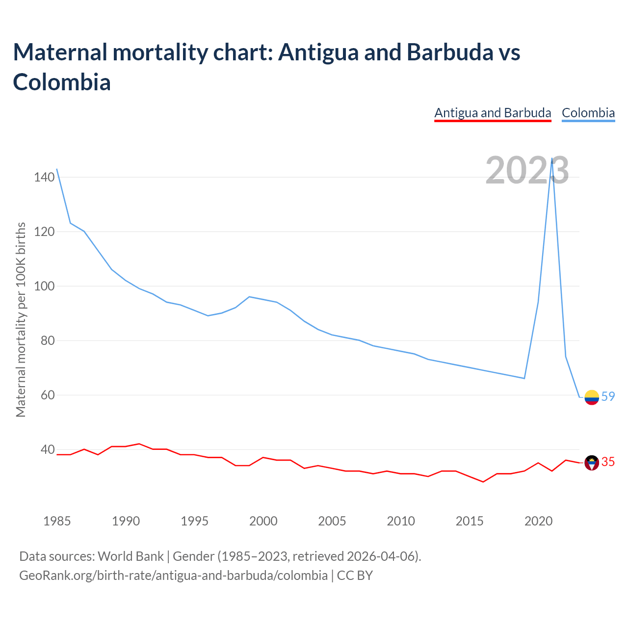 The maternal mortality rate, which is the probability of dying during childbirth or within 42 days of pregnancy termination, is 35 deaths per 100,000 live births in Antigua and Barbuda, compared to 59 deaths in Colombia.