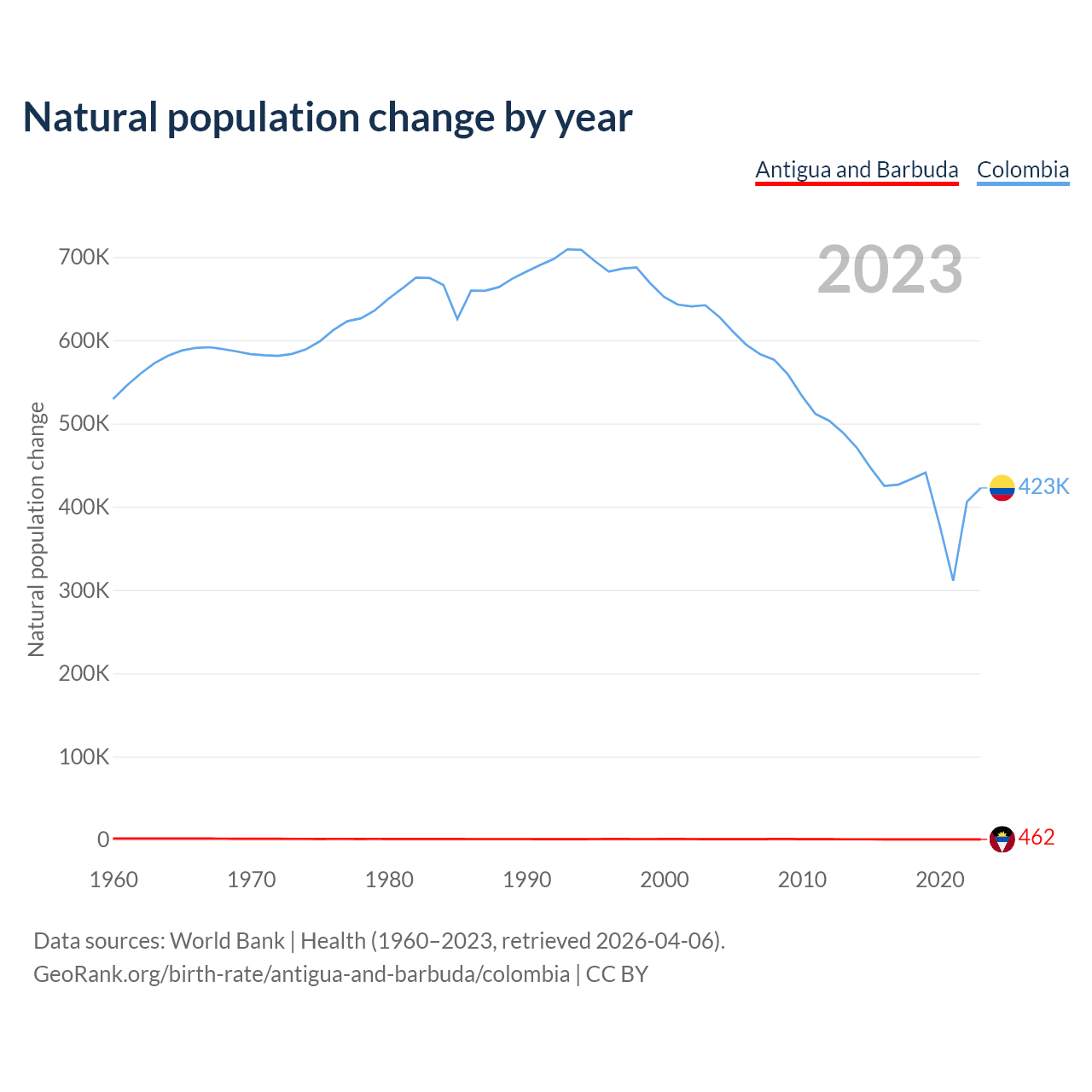 - Antigua and Barbuda is ranked 117/196 by birth rate compared to 106/196 for Colombia.
