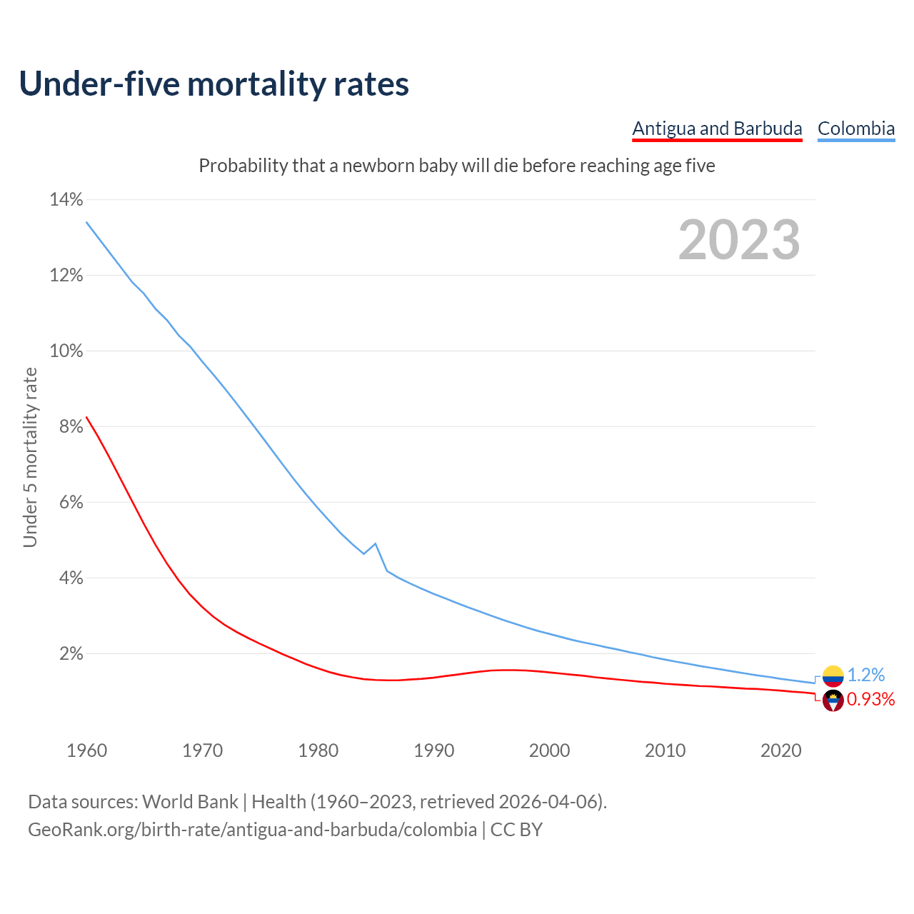 The chance that a newborn baby will die before reaching age five is 0.93% in Antigua and Barbuda and 1.2% in Colombia. Above is a chart with historical data on under-five mortality rates.