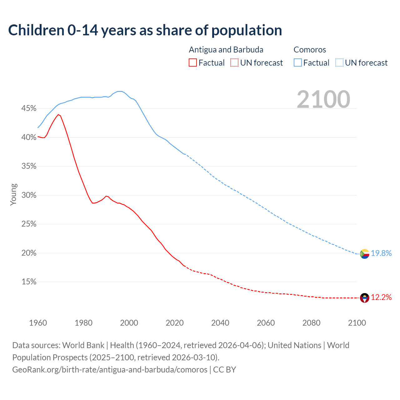Antigua and Barbuda has an annual birth rate of 11.8 births per 1,000 people, compared to 28.7 for Comoros. The average number of children a woman is expected to have during her lifetime — the fertility rate, is 1.58 in Antigua and Barbuda and 3.88 in Comoros — 145.8% difference.