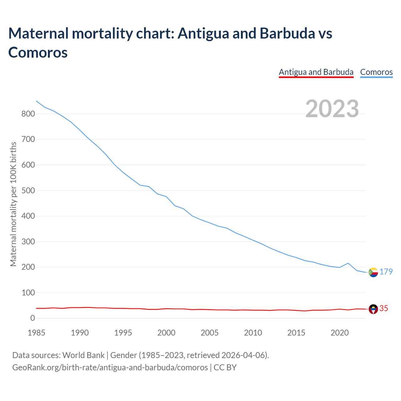 The maternal mortality rate, which is the probability of dying during childbirth or within 42 days of pregnancy termination, is 35 deaths per 100,000 live births in Antigua and Barbuda, compared to 179 deaths in Comoros.