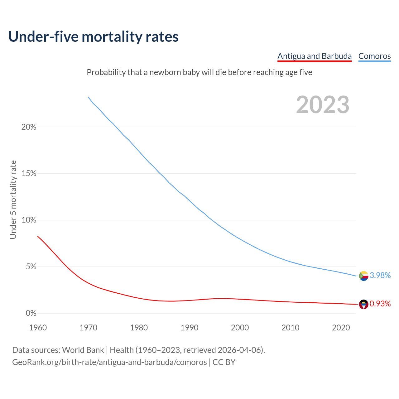 The chance that a newborn baby will die before reaching age five is 0.93% in Antigua and Barbuda and 3.98% in Comoros. Above is a chart with historical data on under-five mortality rates.