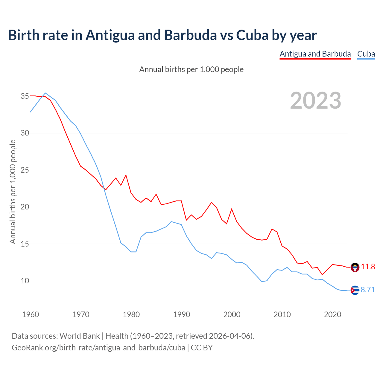 Antigua and Barbuda has an annual birth rate of 11.8 births per 1,000 people, compared to 8.71 for Cuba. The average number of children a woman is expected to have during her lifetime — the fertility rate, is 1.58 in Antigua and Barbuda and 1.44 in Cuba — 8.81% difference.