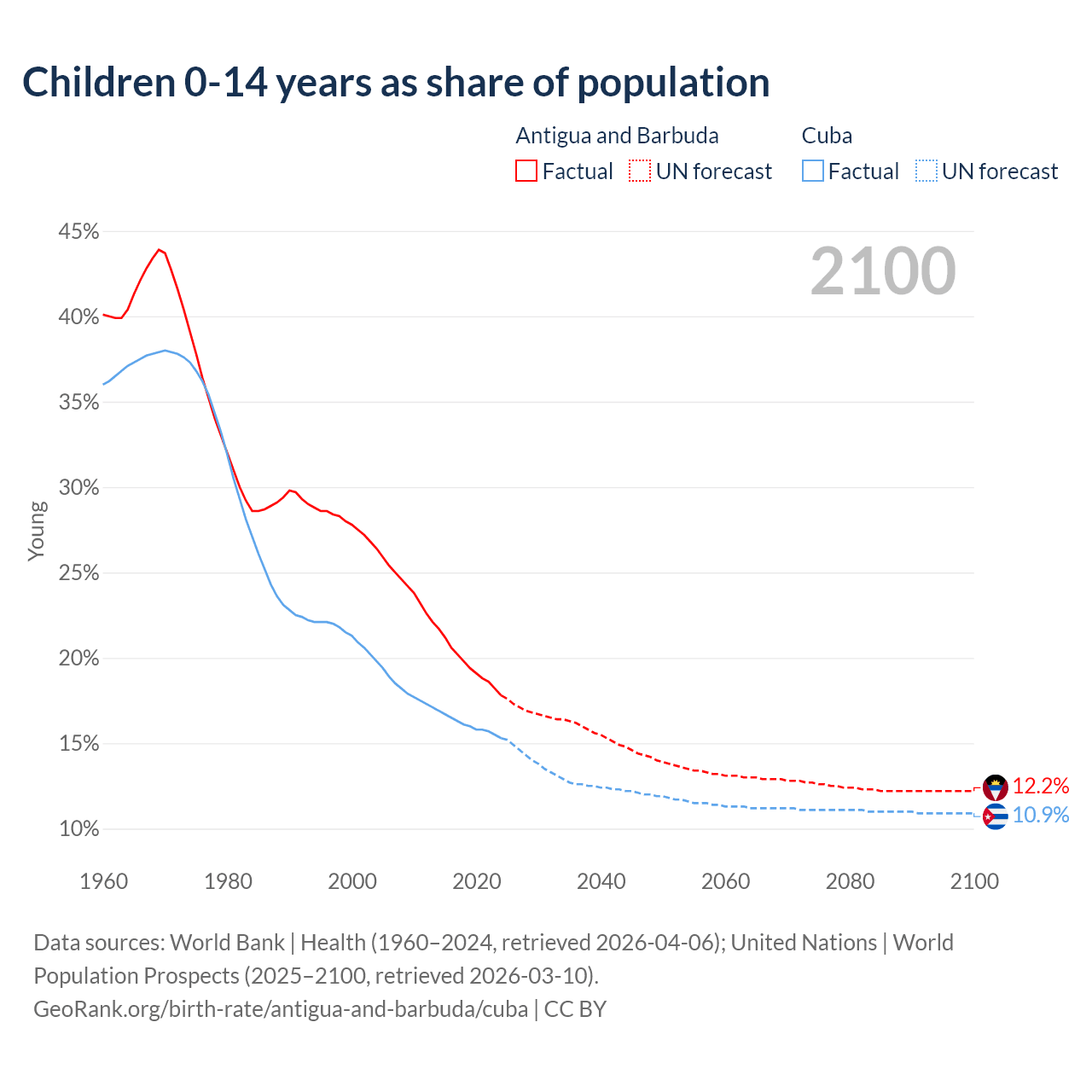According to the latest available data on birth rates, the fertility rate in Antigua and Barbuda was 1.58 children per woman in 2023, compared to 1.44 in Cuba in 2023. The replacement level is considered to be 2.1 children per woman.