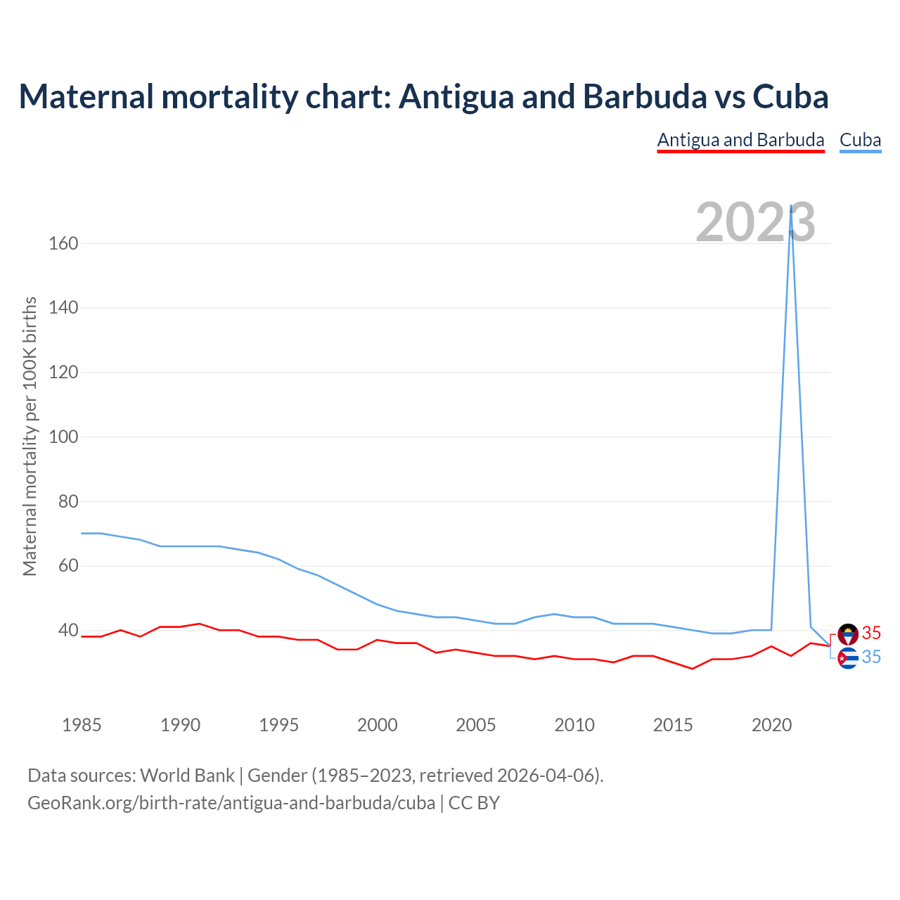 The maternal mortality rate, which is the probability of dying during childbirth or within 42 days of pregnancy termination, is 35 deaths per 100,000 live births in Antigua and Barbuda, compared to 35 deaths in Cuba.