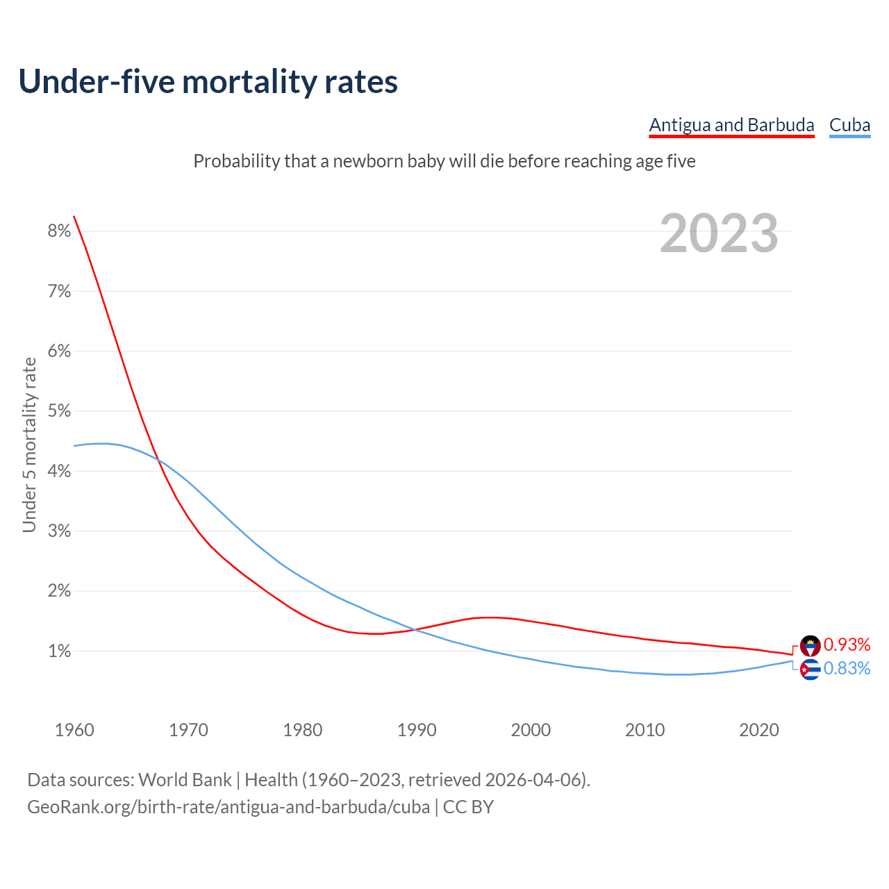 The chance that a newborn baby will die before reaching age five is 0.93% in Antigua and Barbuda and 0.83% in Cuba. Above is a chart with historical data on under-five mortality rates.