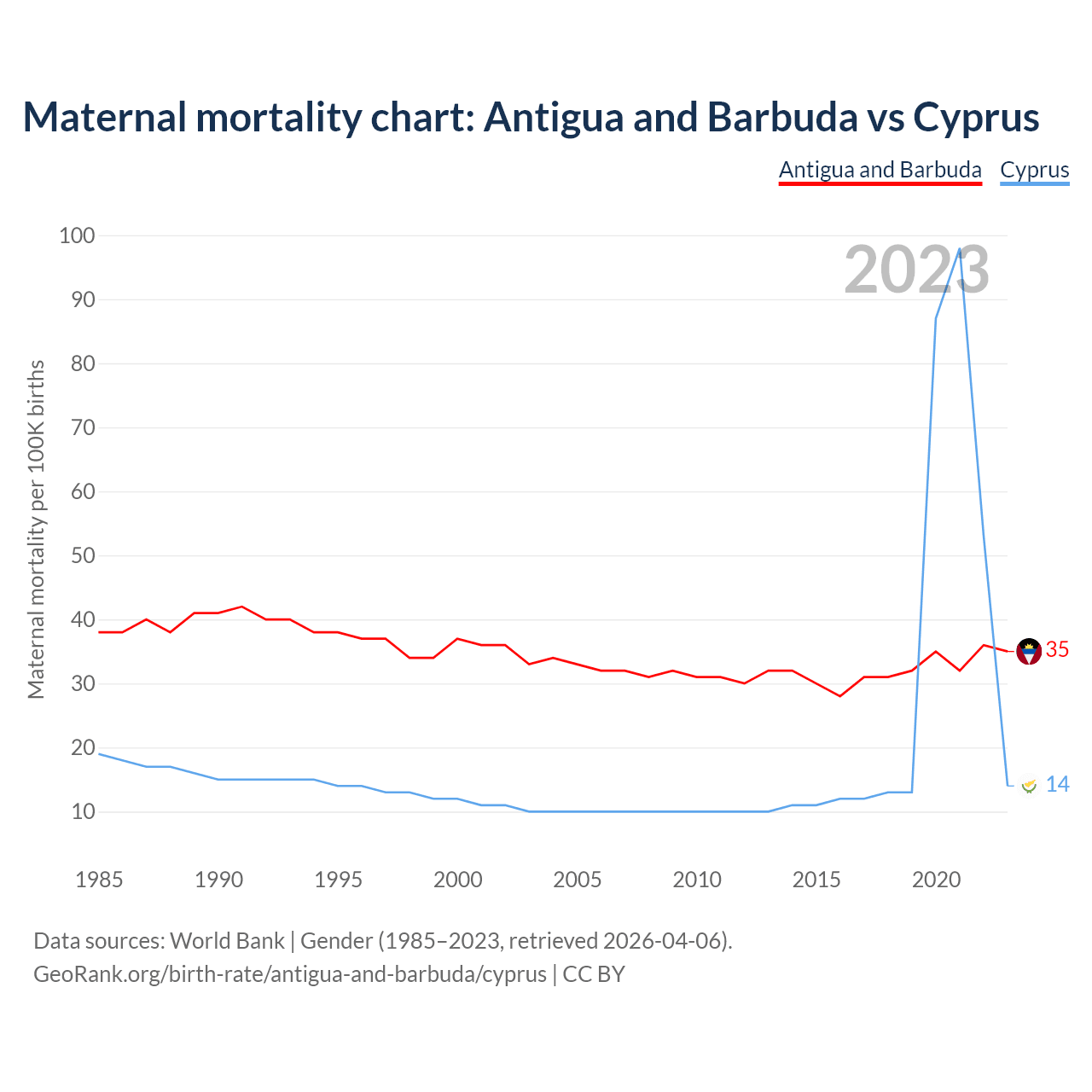The maternal mortality rate, which is the probability of dying during childbirth or within 42 days of pregnancy termination, is 35 deaths per 100,000 live births in Antigua and Barbuda, compared to 14 deaths in Cyprus.
