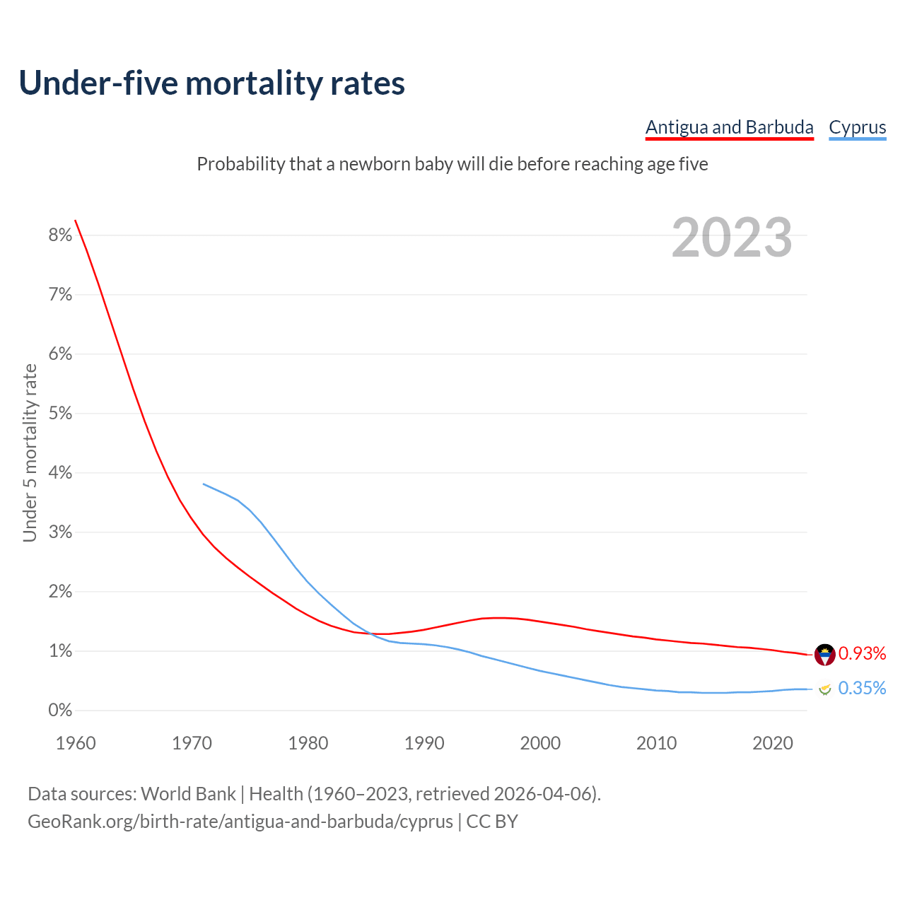 The chance that a newborn baby will die before reaching age five is 0.93% in Antigua and Barbuda and 0.35% in Cyprus. Above is a chart with historical data on under-five mortality rates.