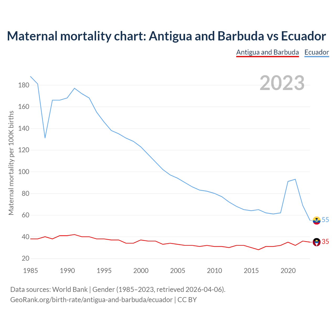 The maternal mortality rate, which is the probability of dying during childbirth or within 42 days of pregnancy termination, is 35 deaths per 100,000 live births in Antigua and Barbuda, compared to 55 deaths in Ecuador.