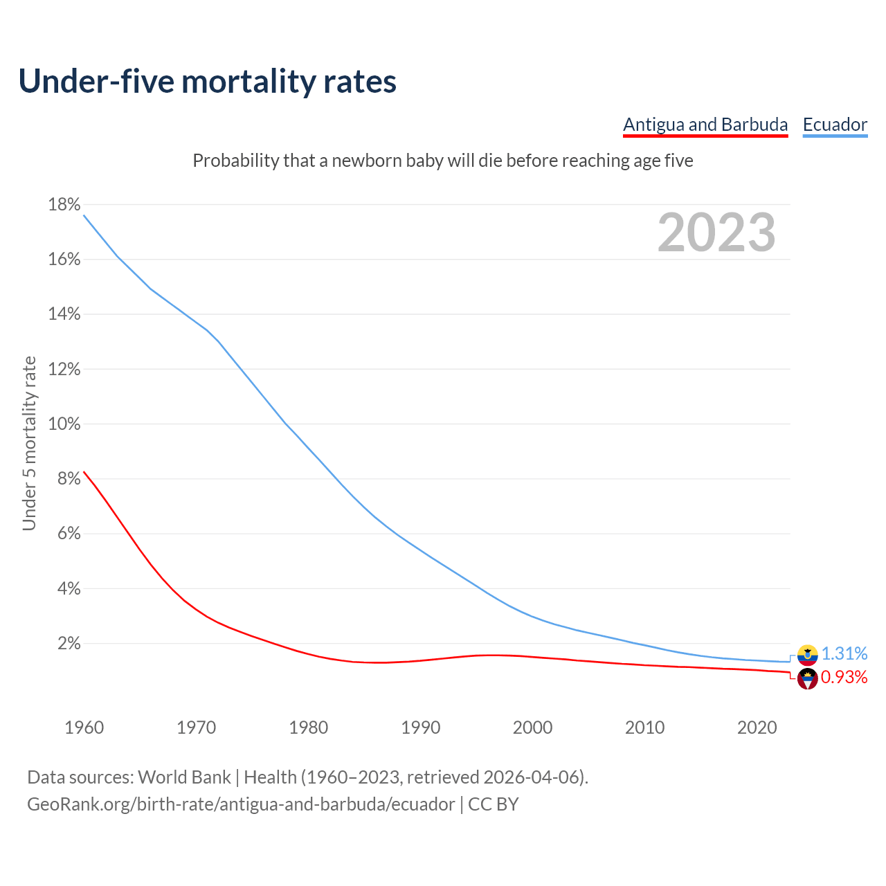 The chance that a newborn baby will die before reaching age five is 0.93% in Antigua and Barbuda and 1.31% in Ecuador. Above is a chart with historical data on under-five mortality rates.