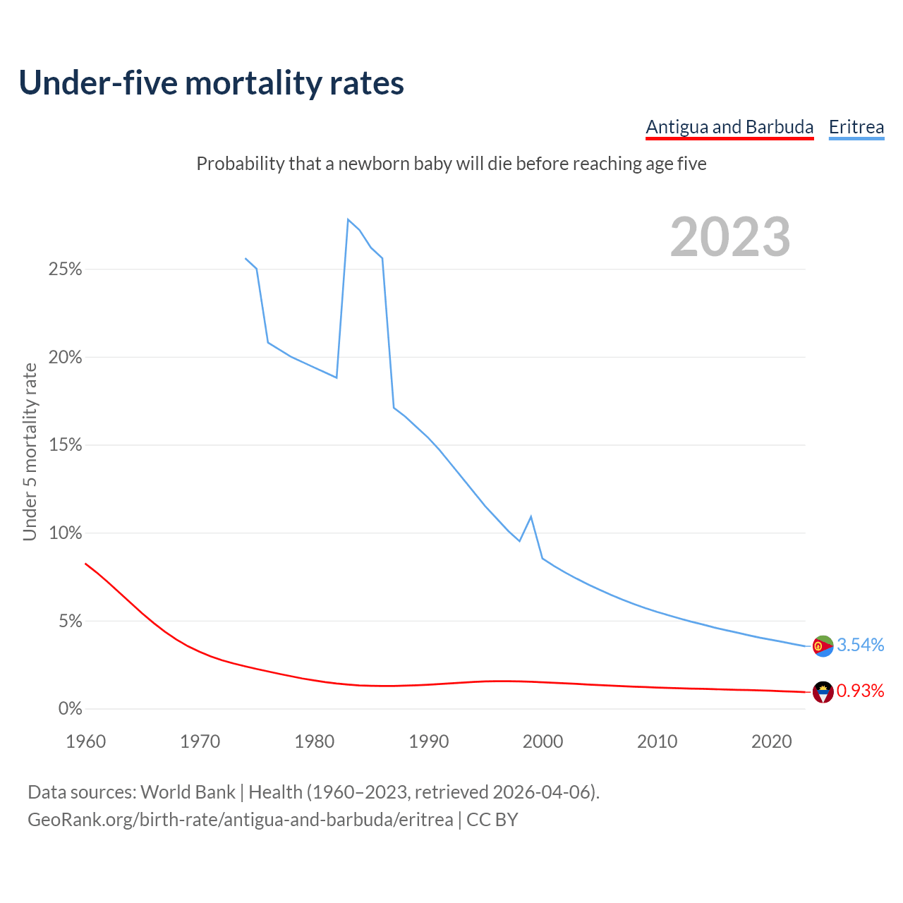 The chance that a newborn baby will die before reaching age five is 0.93% in Antigua and Barbuda and 3.54% in Eritrea. Above is a chart with historical data on under-five mortality rates.