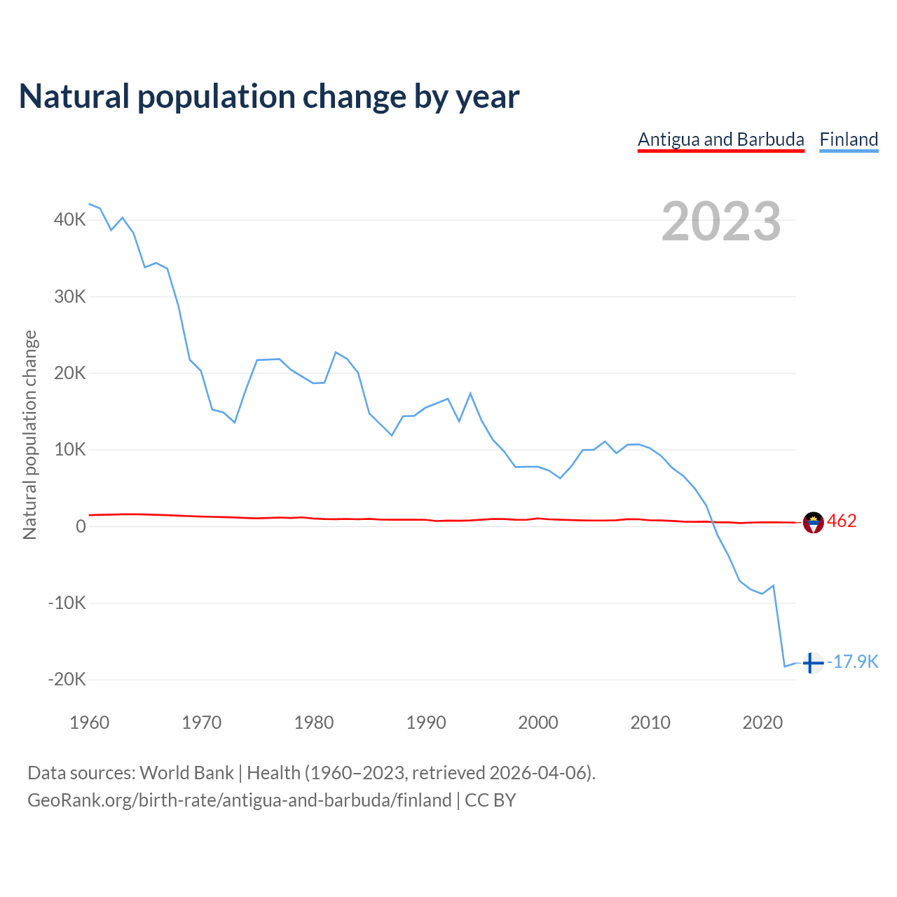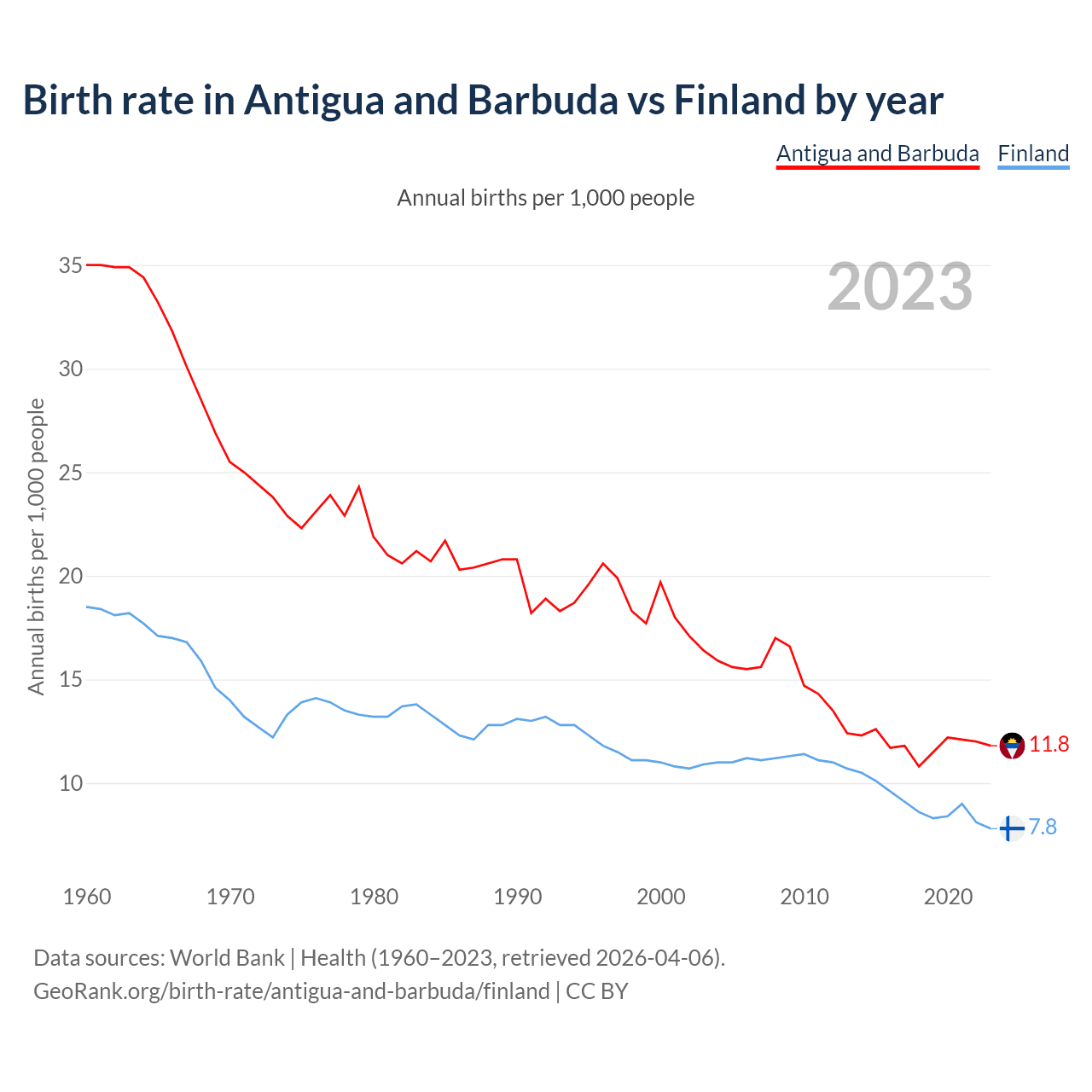 According to the latest available data on birth rates, the fertility rate in Antigua and Barbuda was 1.58 children per woman in 2023, compared to 1.26 in Finland in 2023. The replacement level is considered to be 2.1 children per woman.