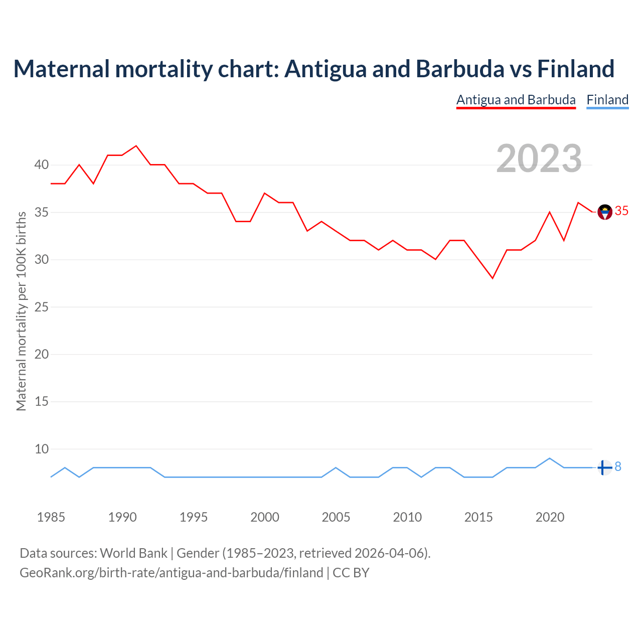 The maternal mortality rate, which is the probability of dying during childbirth or within 42 days of pregnancy termination, is 35 deaths per 100,000 live births in Antigua and Barbuda, compared to 8 deaths in Finland.