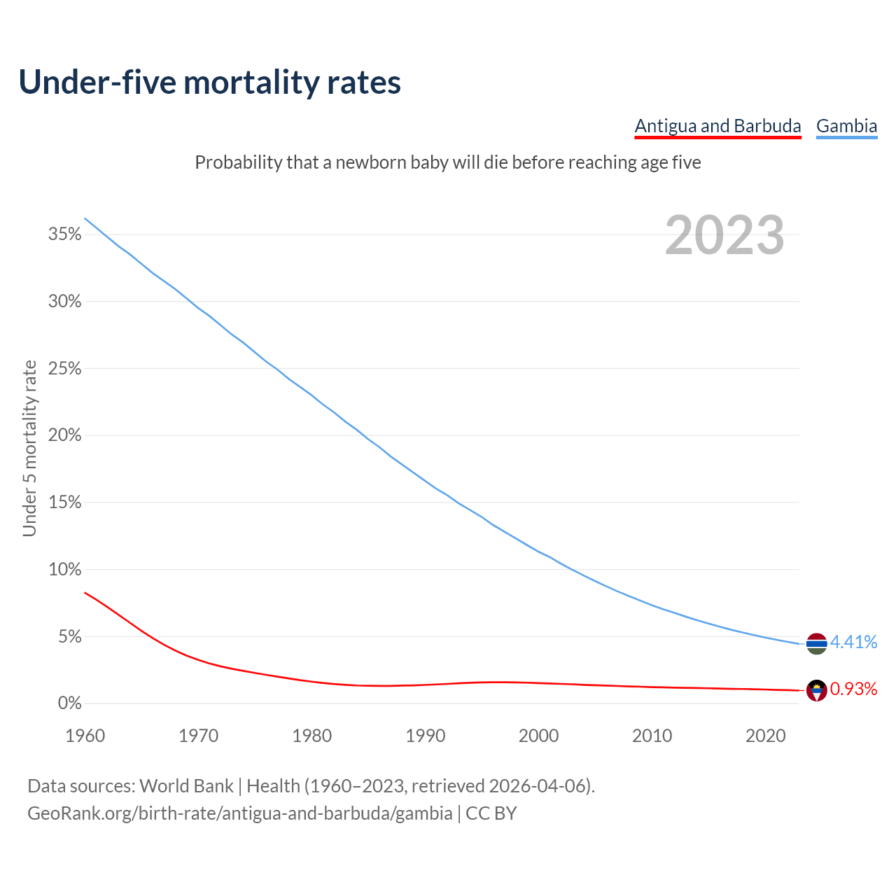 The chance that a newborn baby will die before reaching age five is 0.93% in Antigua and Barbuda and 4.41% in the Gambia. Above is a chart with historical data on under-five mortality rates.
