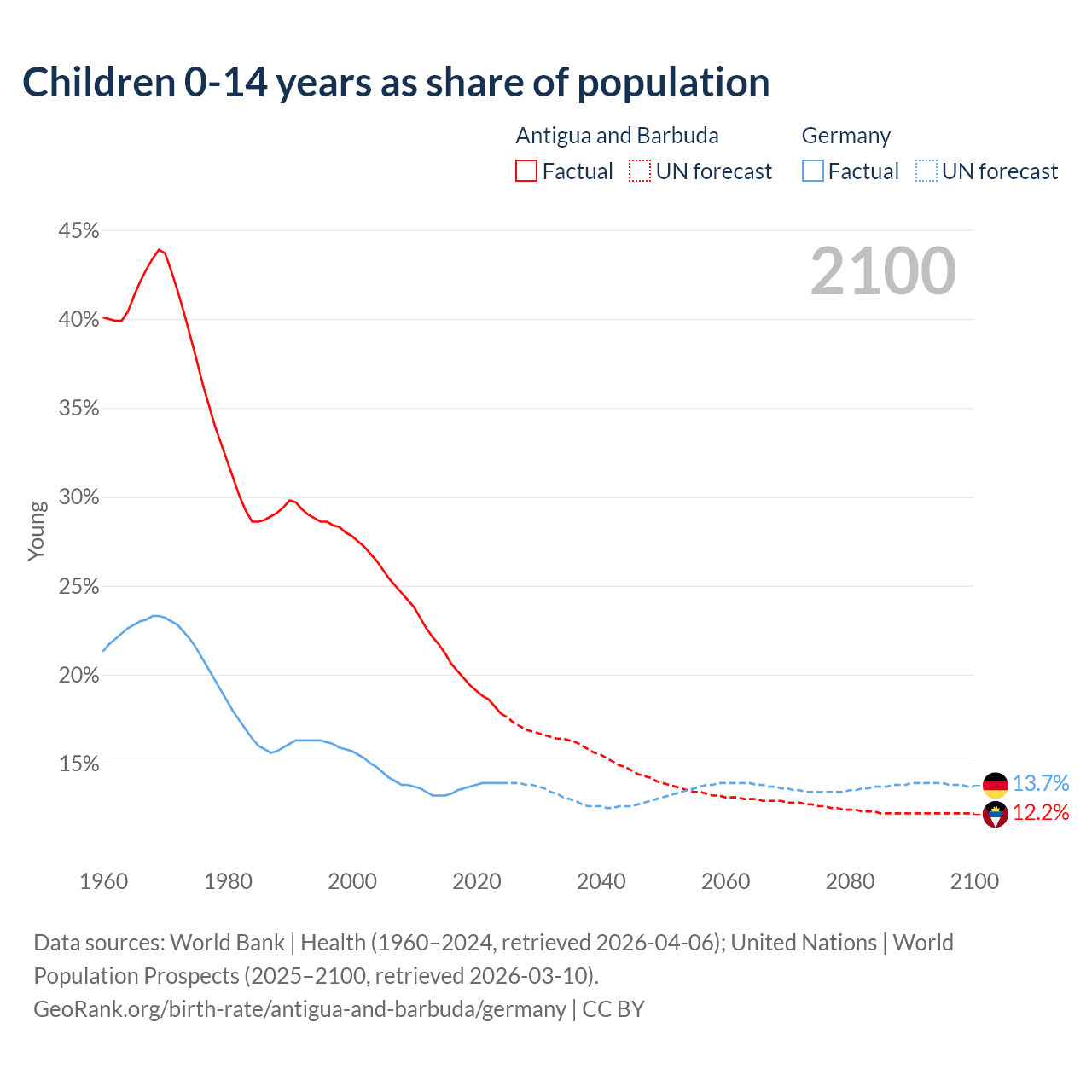 According to the latest available data on birth rates, the fertility rate in Antigua and Barbuda was 1.58 children per woman in 2023, compared to 1.39 in Germany in 2023. The replacement level is considered to be 2.1 children per woman.