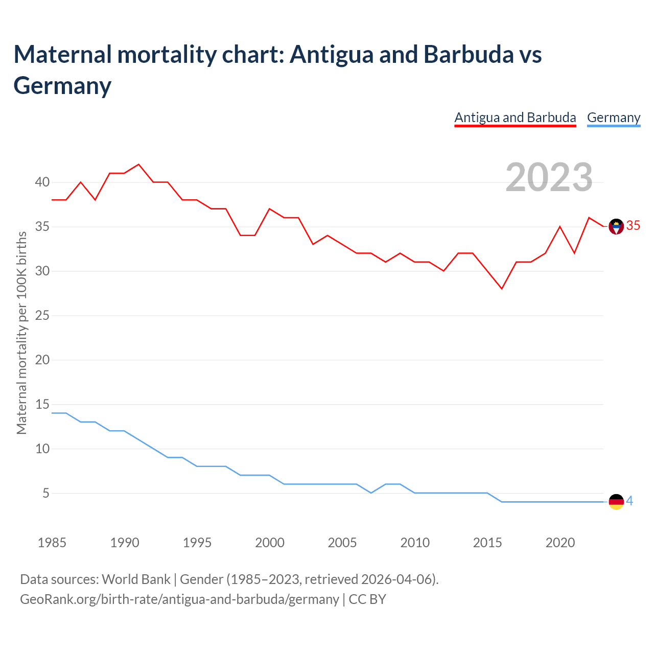 The maternal mortality rate, which is the probability of dying during childbirth or within 42 days of pregnancy termination, is 35 deaths per 100,000 live births in Antigua and Barbuda, compared to 4 deaths in Germany.