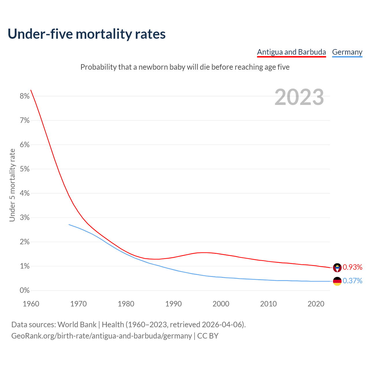 The chance that a newborn baby will die before reaching age five is 0.93% in Antigua and Barbuda and 0.37% in Germany. Above is a chart with historical data on under-five mortality rates.