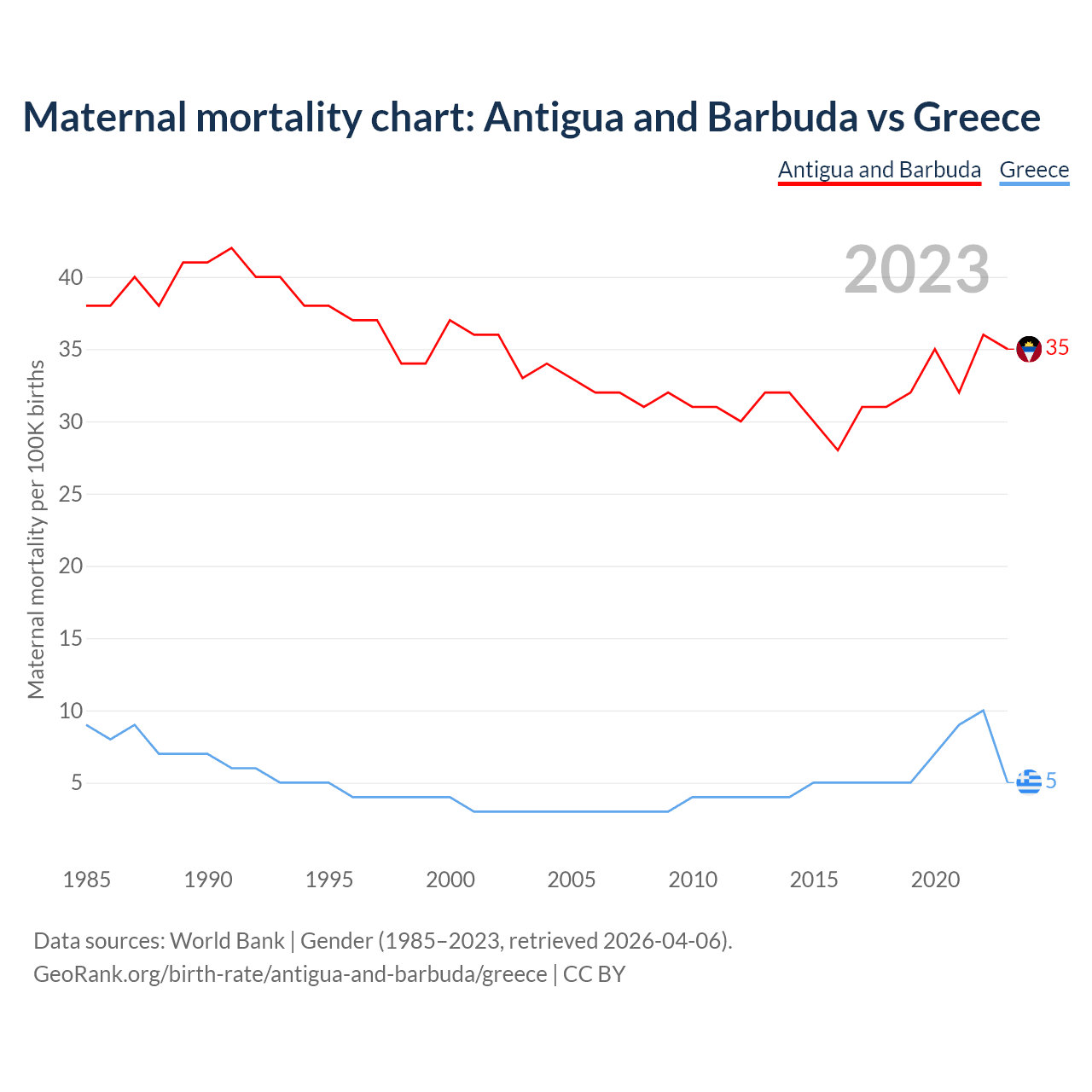 The maternal mortality rate, which is the probability of dying during childbirth or within 42 days of pregnancy termination, is 35 deaths per 100,000 live births in Antigua and Barbuda, compared to 5 deaths in Greece.