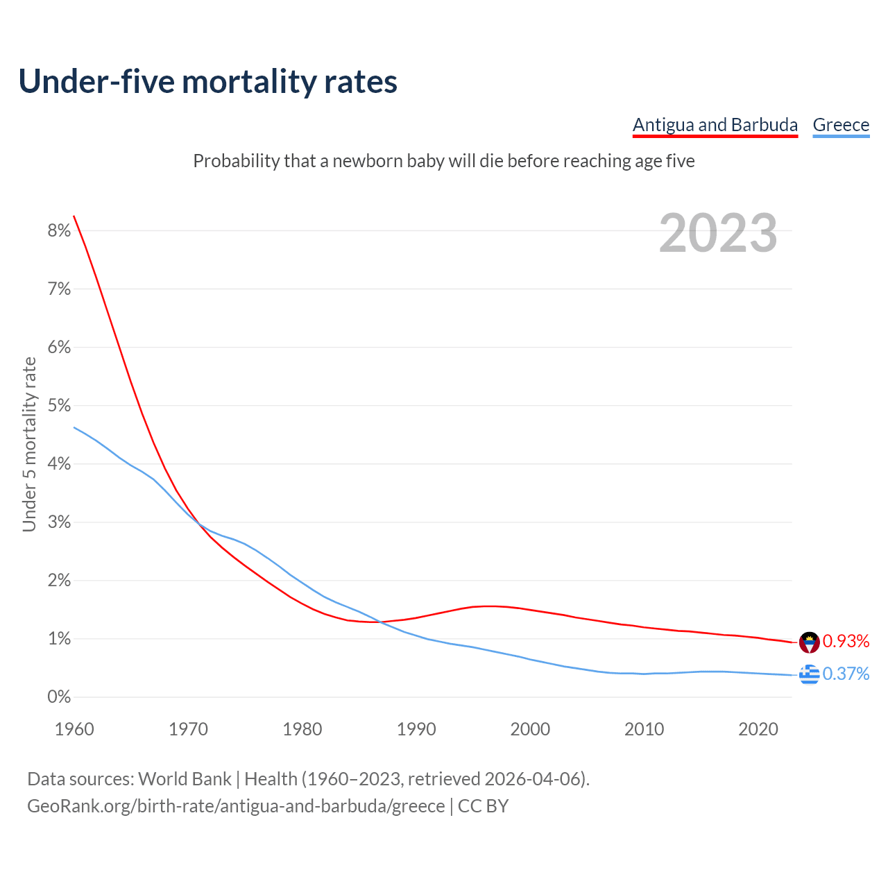 The chance that a newborn baby will die before reaching age five is 0.93% in Antigua and Barbuda and 0.37% in Greece. Above is a chart with historical data on under-five mortality rates.