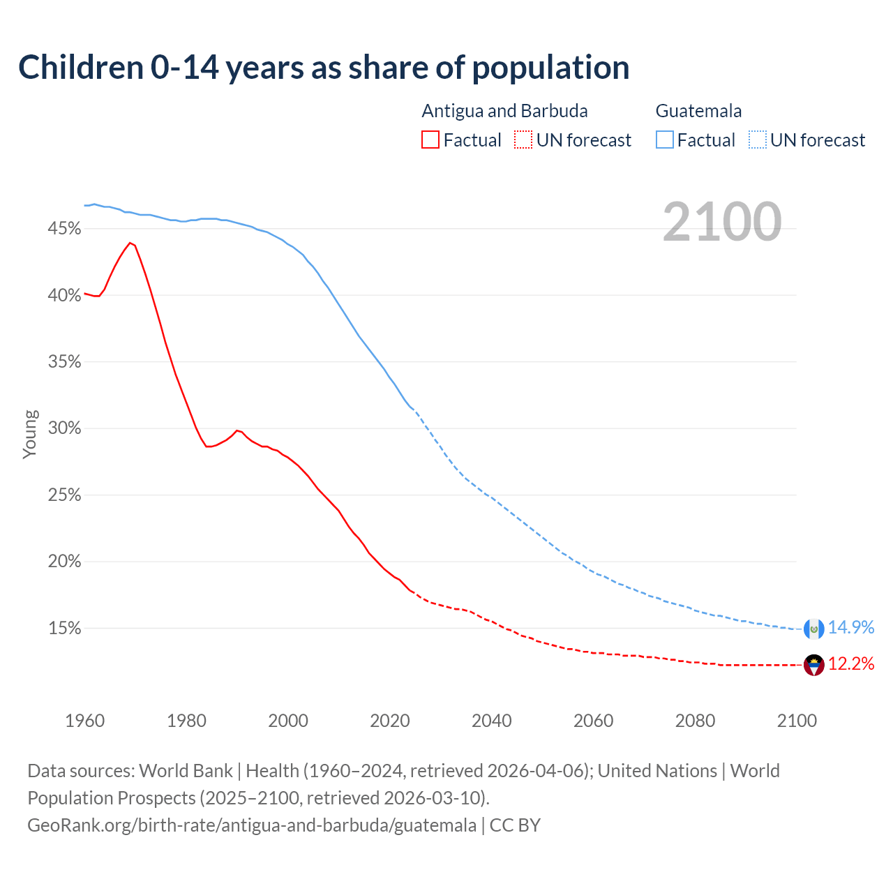 According to the latest available data on birth rates, the fertility rate in Antigua and Barbuda was 1.58 children per woman in 2023, compared to 2.31 in Guatemala in 2023. The replacement level is considered to be 2.1 children per woman.