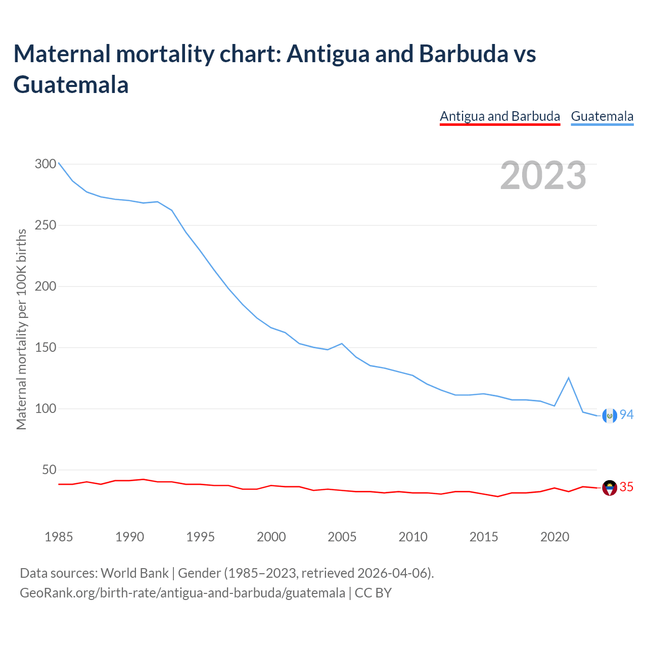 The maternal mortality rate, which is the probability of dying during childbirth or within 42 days of pregnancy termination, is 35 deaths per 100,000 live births in Antigua and Barbuda, compared to 94 deaths in Guatemala.