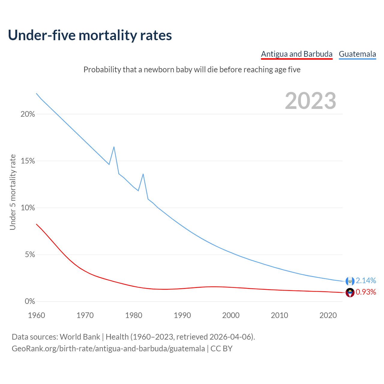 The chance that a newborn baby will die before reaching age five is 0.93% in Antigua and Barbuda and 2.14% in Guatemala. Above is a chart with historical data on under-five mortality rates.