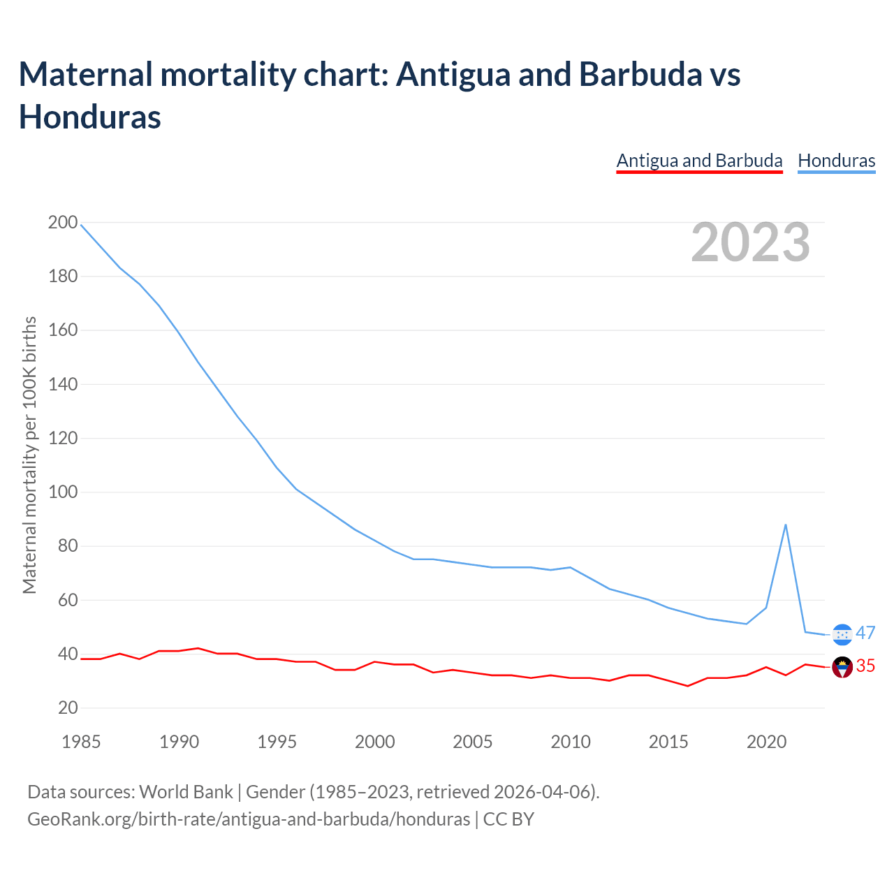 The maternal mortality rate, which is the probability of dying during childbirth or within 42 days of pregnancy termination, is 35 deaths per 100,000 live births in Antigua and Barbuda, compared to 47 deaths in Honduras.