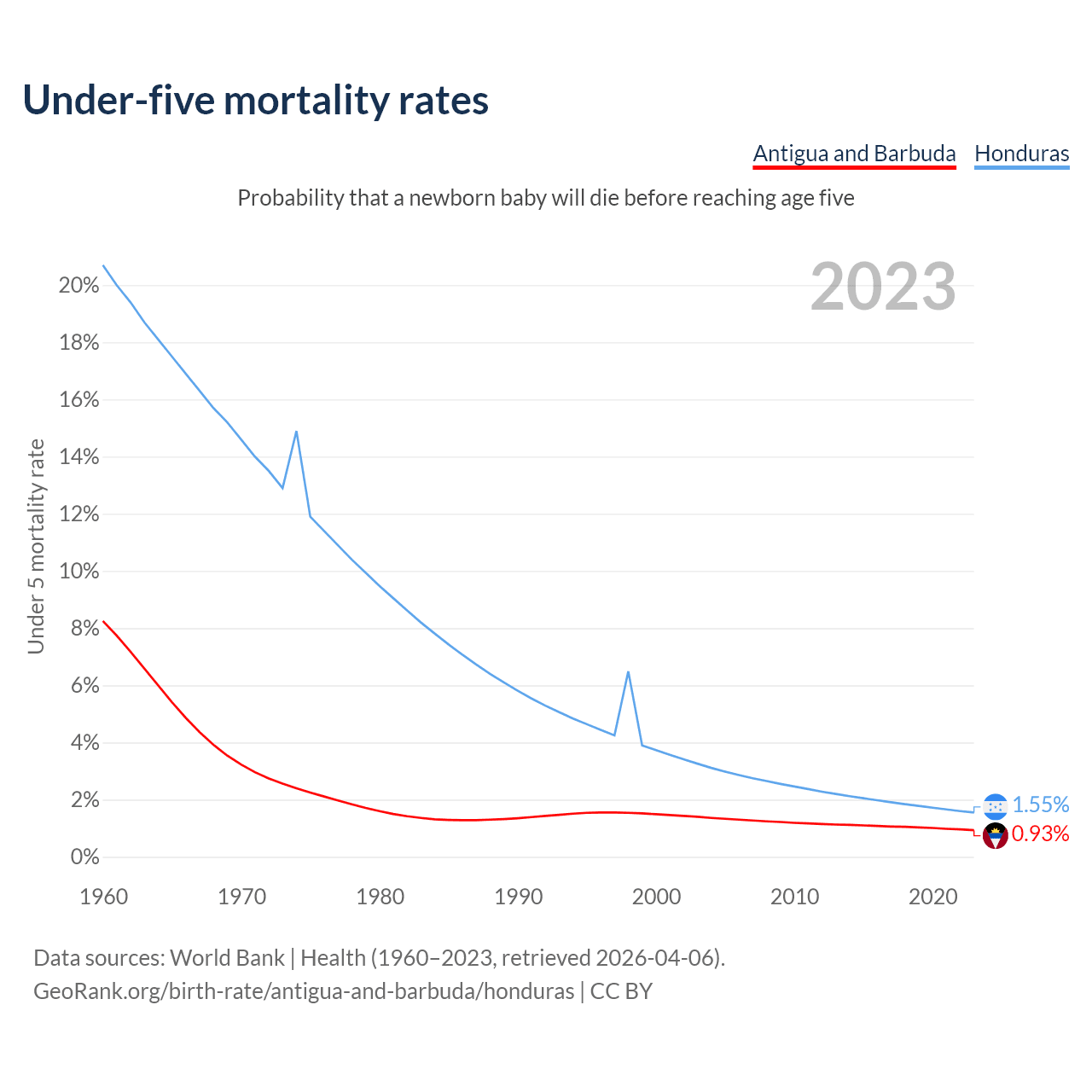 The chance that a newborn baby will die before reaching age five is 0.93% in Antigua and Barbuda and 1.55% in Honduras. Above is a chart with historical data on under-five mortality rates.