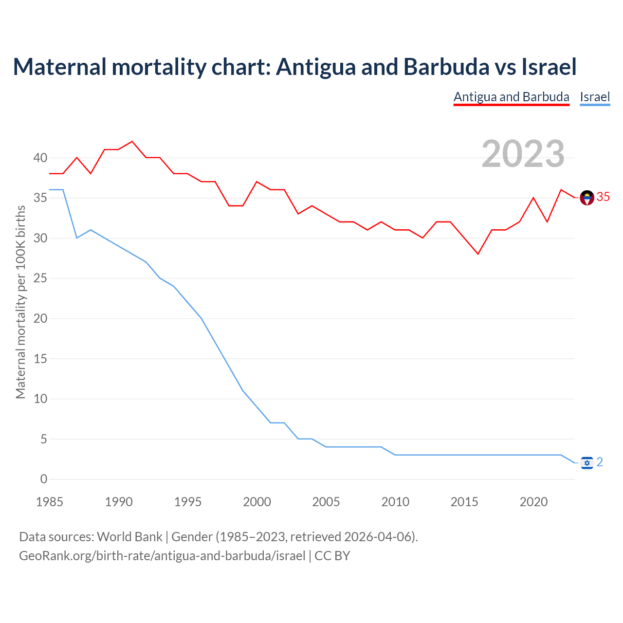 The maternal mortality rate, which is the probability of dying during childbirth or within 42 days of pregnancy termination, is 35 deaths per 100,000 live births in Antigua and Barbuda, compared to 2 deaths in Israel.