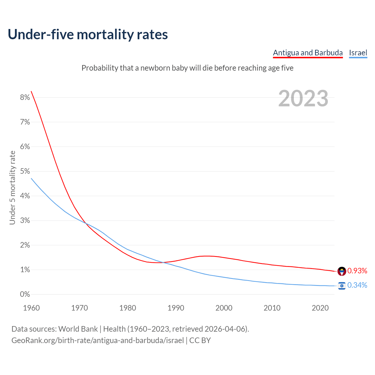 The chance that a newborn baby will die before reaching age five is 0.93% in Antigua and Barbuda and 0.34% in Israel. Above is a chart with historical data on under-five mortality rates.