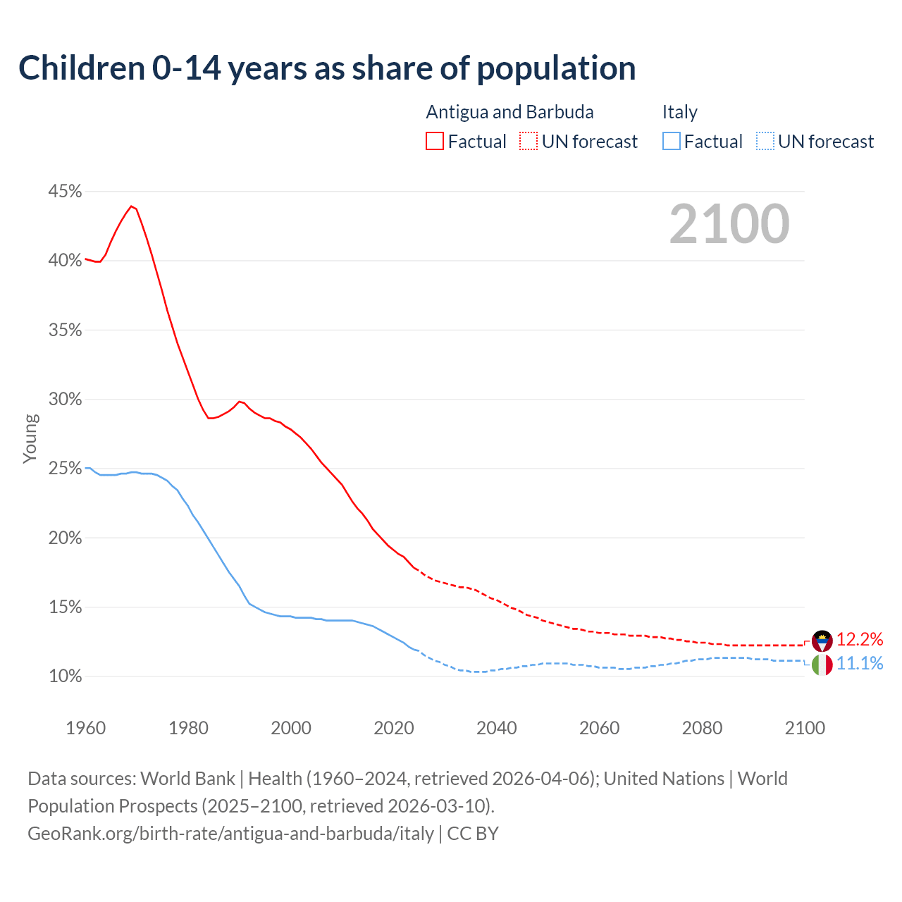 Antigua and Barbuda has an annual birth rate of 11.8 births per 1,000 people, compared to 6.4 for Italy. The average number of children a woman is expected to have during her lifetime — the fertility rate, is 1.58 in Antigua and Barbuda and 1.2 in Italy — 24% difference.