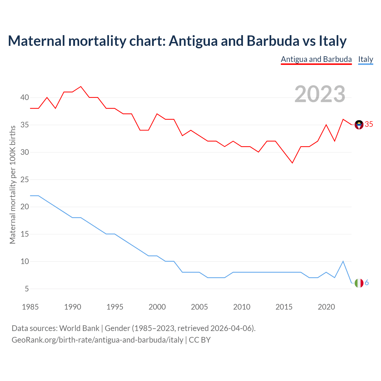 The maternal mortality rate, which is the probability of dying during childbirth or within 42 days of pregnancy termination, is 35 deaths per 100,000 live births in Antigua and Barbuda, compared to 6 deaths in Italy.