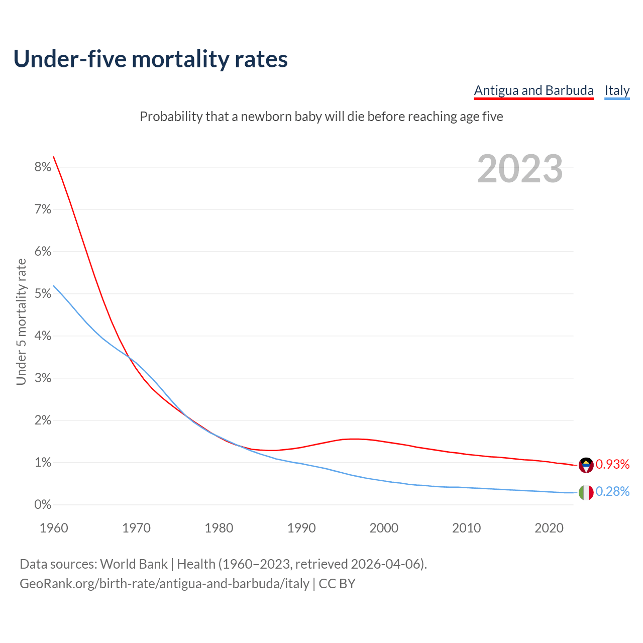 The chance that a newborn baby will die before reaching age five is 0.93% in Antigua and Barbuda and 0.28% in Italy. Above is a chart with historical data on under-five mortality rates.