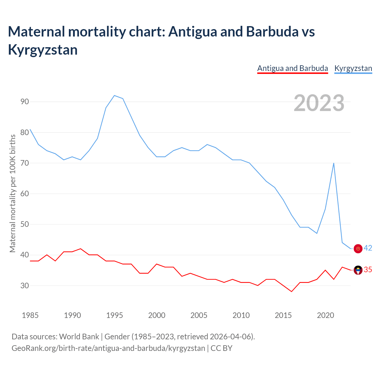 The maternal mortality rate, which is the probability of dying during childbirth or within 42 days of pregnancy termination, is 35 deaths per 100,000 live births in Antigua and Barbuda, compared to 42 deaths in Kyrgyzstan.
