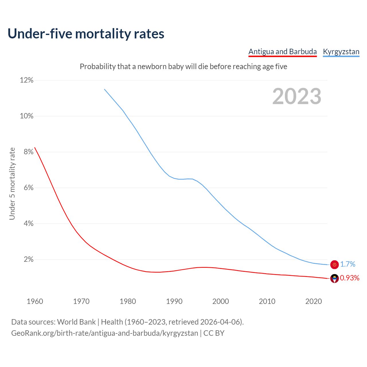 The chance that a newborn baby will die before reaching age five is 0.93% in Antigua and Barbuda and 1.7% in Kyrgyzstan. Above is a chart with historical data on under-five mortality rates.