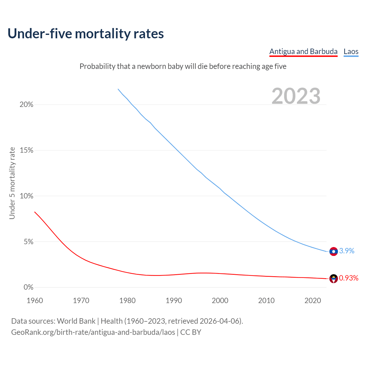 The chance that a newborn baby will die before reaching age five is 0.93% in Antigua and Barbuda and 3.9% in Laos. Above is a chart with historical data on under-five mortality rates.